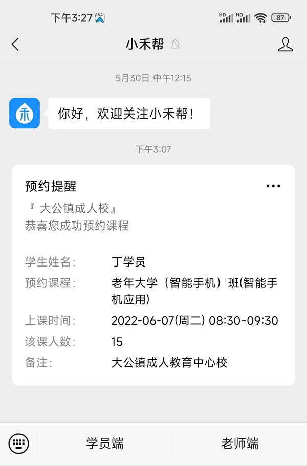 10、在“小禾帮”公众号首页,看到预约成功消息。