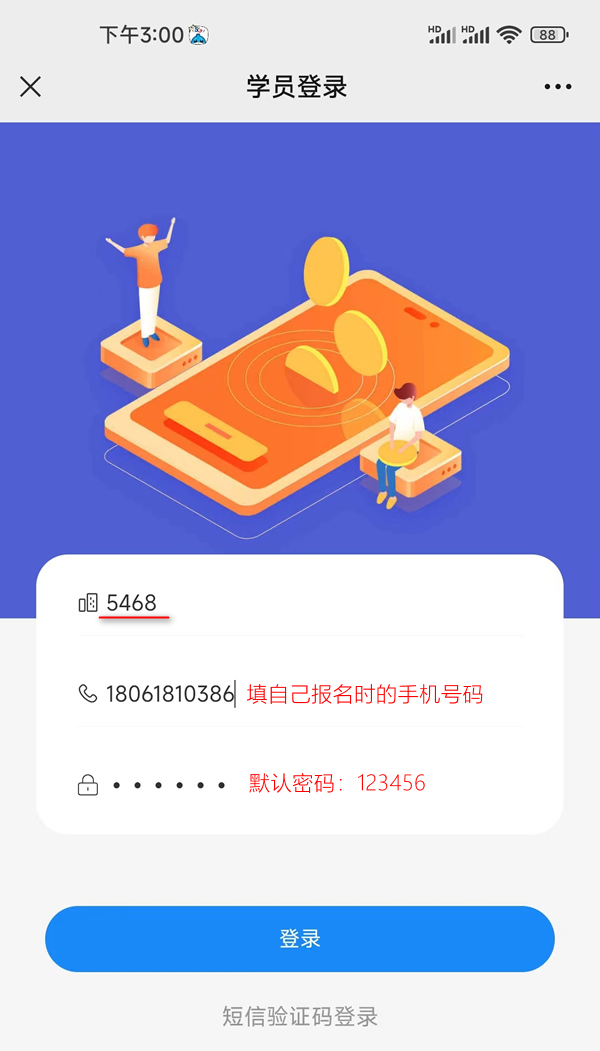 06、第一行机构编码:5468,第二行填报名时预留的手机号码,第三行默认密码:123456;