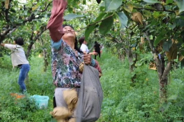 其他人用筐装梨,这位阿姨为了赶速度,干脆用兜装梨。阿姨,您慢点,梨都掉地上啦!
