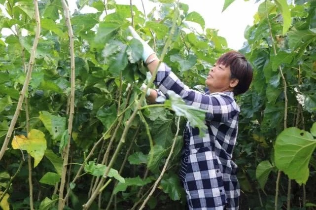 拎着采摘的桑叶,农民选手很开心!