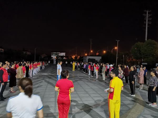 9月27日晚,海安市大公镇体育志愿者组织全镇近两百名中老年爱好者,在镇便民文化中心广场,身着红黄相间的服装,排成一列列整齐纵队,在领舞老师的带动下有节拍的挥动着手臂、扭动着腰身和脖颈,甚是壮观。