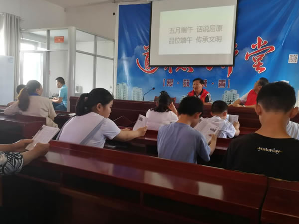2020年6月25日上午,多名志愿者和中小学生来到常河村校外教育辅导站,村关工委常务副主任袁金凤同志为同学们讲述了五月初五称为端午的考证、端午节为传统节日的由来、端午节的诸多礼俗、端午节历史人物的纪念等内容。