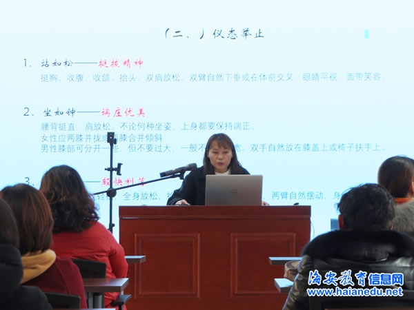 宣讲者首先从文明礼仪的定义、形成、分类、重要性等几个方面进行简单概述,让学员对文明礼仪有一个大致的理论性的认识。接着宣讲员详细讲述了基本礼仪中仪表言谈和仪态举止的具体要求:仪表——整洁雅观、穿着——得体大方、言谈——礼貌亲切、站如松——挺拔精神、坐如钟——端庄优美、行如风——轻快利落。学员们一边听一边当场学做,兴致盎然。随后,宣讲员重点向学员们讲解了餐桌上的礼仪,从入座到离座,列出了九条简单好记的要点。一段由李伟健主演的相声《礼仪漫谈》把宣讲会推向高潮,大家在轻松愉悦的气氛中,再一次感受了文明礼仪的魅力。