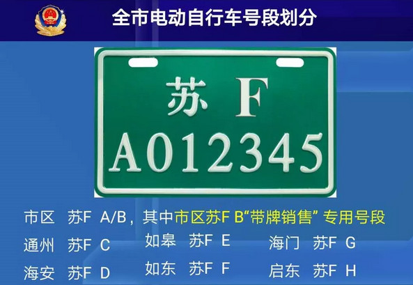 新国标电动自行车号牌尺寸为16cm×10cm×1mm,机动车号牌级反光膜,底色淡绿色,文字白色;苏F代表江苏省南通市,D代表海安,后6位为数字。让我们先睹一下新国标电动自行车的车牌的“芳容”吧!